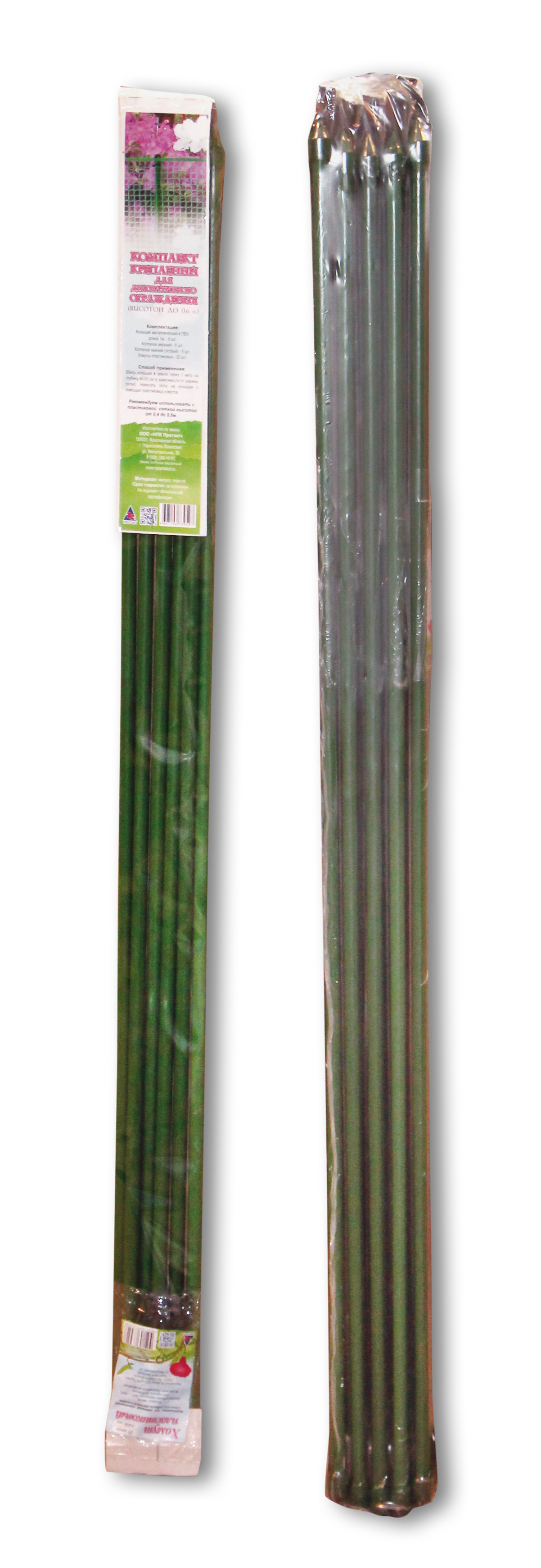 металлические стойки в ПВХ-оболочке (не ржавеют, долговечны, практичны) в количестве, достаточном для установки 5-метрового ограждения. Стойки оснащены пластиковыми наконечниками, которые защищают металлический стержень от проникновения влаги и облегчают их установку в грунт.